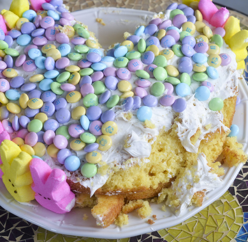 There was a cake at my grocery store that inspired me to make this. The cake was a two layer cake with marshmallow peeps around it and M&M’s on top. They wanted 20.00 for the cake too, and my only thought was that is way too expensive! I made this cake for under 10.00 using boxed cake mix. Had all the ingredients at home to make the cake, and just had to go out and buy some peep marshallows which were 1.29 a box, and a bag of pastel colored M&M’s for the top. Oh yah, and the frosting I had to buy too. Hope you like it!