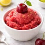 This delicious cherry sorbet is pretty easy and only requires 3 ingredients to make. No ice cream maker is needed to make this either and it's only a few simple steps to make