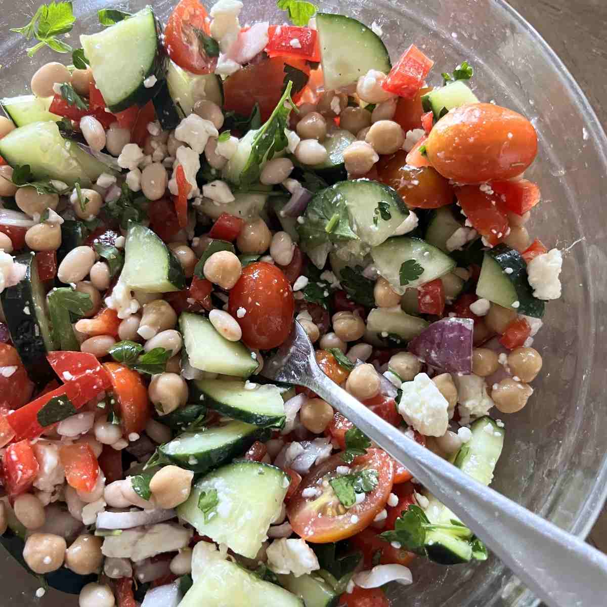 - ยฝ cucumber (diced) โ adds freshness and crunch, which helps balance the heavier beans and makes the salad feel lighter