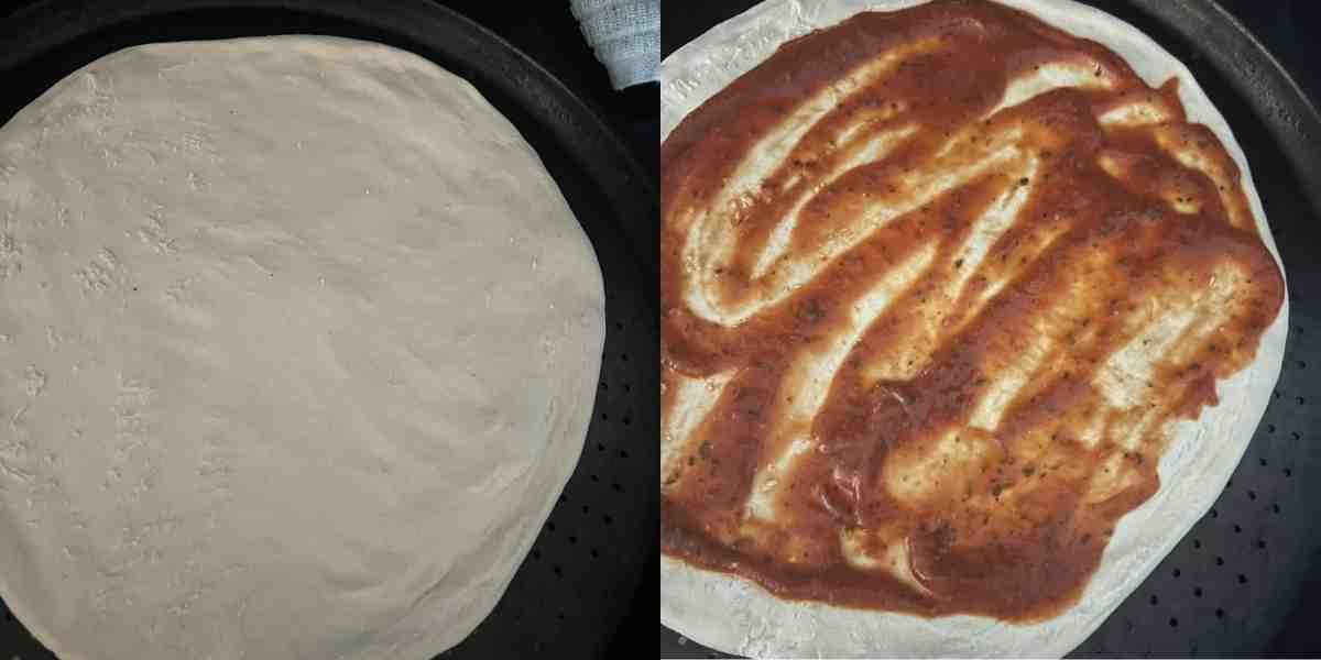 Spread a thin layer of pizza sauce over the dough, leaving a small border around the edges.